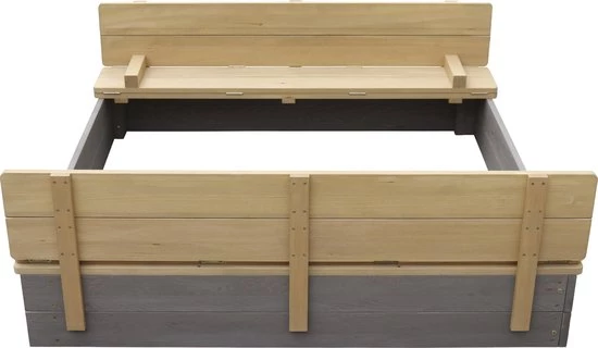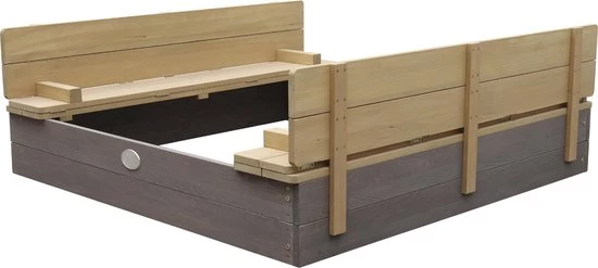 - Veelzijdige zandbak met houten deksel, die gemakkelijk kan worden opengeklapt en dan twee bankjes vormt.
