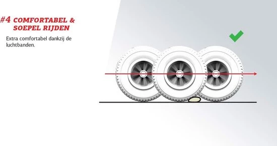 Luchtbanden geven daarnaast minder rolweerstand dan massieve banden waardoor je sneller kan rijden. De schommelas van de skelter zorgt dat alle vier de wielen altijd de grond raken, ook op oneffen terreinen.