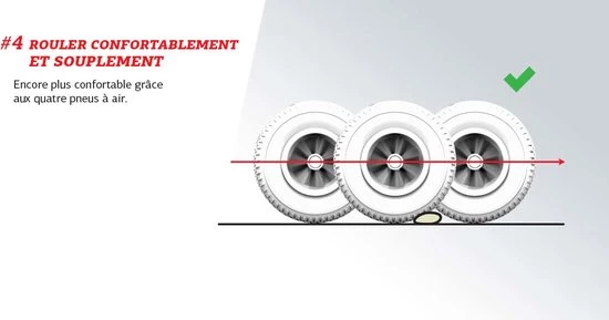 Luchtbanden geven daarnaast minder rolweerstand dan massieve banden waardoor je sneller kan rijden. De schommelas van de skelter zorgt dat alle vier de wielen altijd de grond raken, ook op oneffen terreinen.