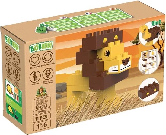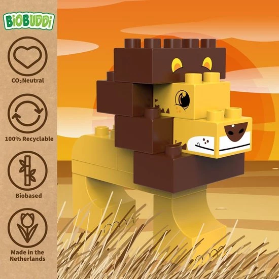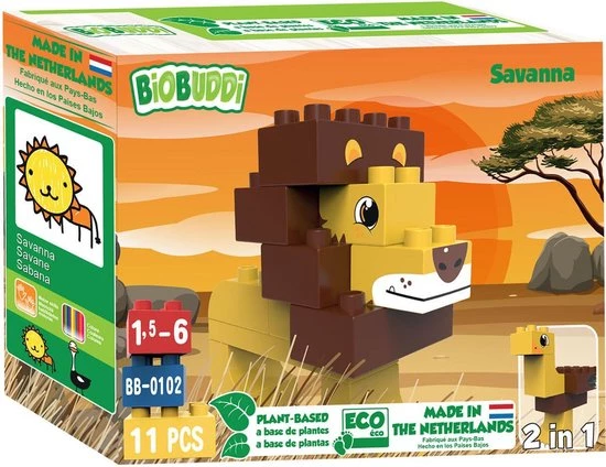 Blokkenset met bouwblokken gemaakt van hernieuwbaar materiaal! Het materiaal is erg vergelijkbaar met kunststof en is gemaakt van afval van de suikerriet industrie. Breng de warme savanne tot leven en bouw een stoere leeuw of een supersnelle struisvogel. Combineer de Savanne set met de andere dieren van de Wildlife reeks zoals de olifant of de giraf (apart verkrijgbaar). De speelgoedblokken hebben verschillende kleuren en maten. Milieuvriendelijk geproduceerd Materiaal: Polyethyleen Inhoud: 11 bouwblokken (geel, bruin), bouwinstructies.