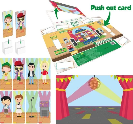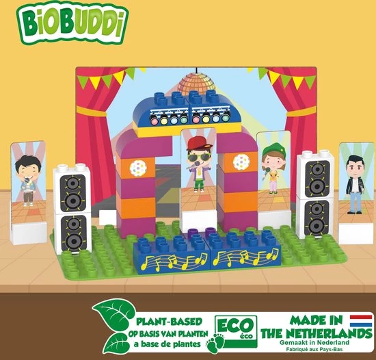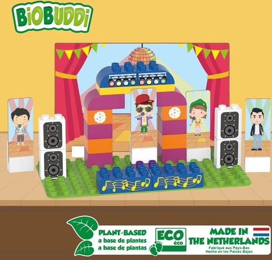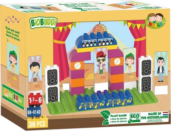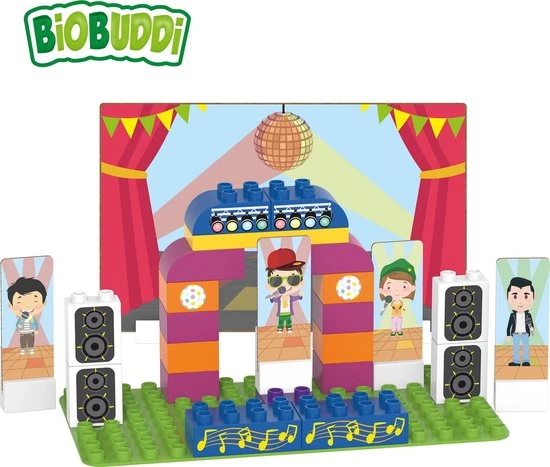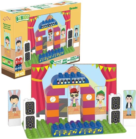 Hou je eigen feest met de BiOBUDDi Karaoke speelset. Zing je favoriete liedjes, dans met de muziek en laat die disco ball maar schijnen! De leerzame en leuke speelset Karaoke bevat 36 bouwblokken, 5 uitdrukkaartjes met nieuwe personages, zoals de DJ en onze bekende popstars, en een gloednieuw achtergrond. Alle kaartjes zijn verwerkt in de 100% recyclebare verpakking! Onze speelgoedblokken zijn speciaal gemaakt door kinderen van 1.5 tot 6 jaar, gemaakt van resten uit de suikerriet plant. De blokken zijn milieuvriendelijk, recyclebaar, duurzaam en ook uitwisselbaar met andere merken. Het helpt kinderen met het ontwikkelen van zowel motorische, cognitieve en creatieve vaardigheden tijdens het spelen. Met BiOBUDDi laat je zien dat je verantwoord omgaat met de planeet en toekomst van de aarde. Daarnaast staat BiOBUDDi garant voor uren veilig en verantwoord speelplezier.