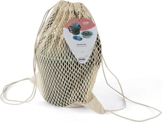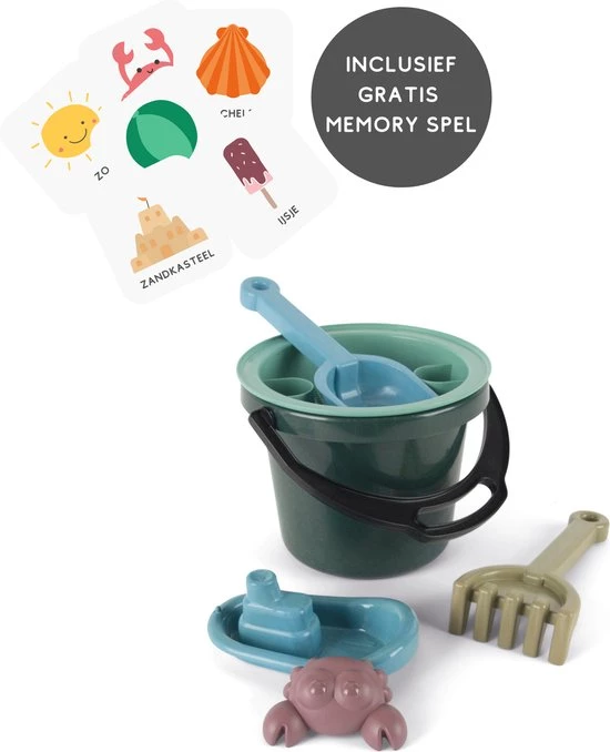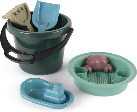 Een mooie emmerset met een zeef, emmer, boot, hark, schep en zandvorm. De set biedt veel mogelijkheden voor zintuigelijk spel en het verkennen van zand en water in de vrije natuur.