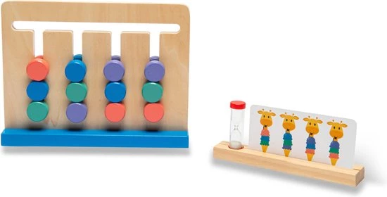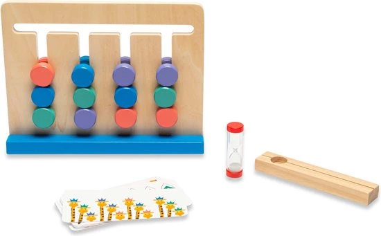 Kijk goed naar de giraffen en het kleurenpatroon op de kaart. Schuif nu de puzzel in dezelfde volgorde als het patroon. Gaat het goed? Probeer dan eens of je het binnen de tijd van de zandloper kan.