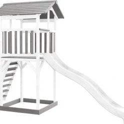 AXI Beach Tower Speeltoestel In Grijs/Wit – Speeltoren Met Zandbak En Witte Glijbaan – FSC Hout – Speelhuis Op Palen Voor De Tuin
