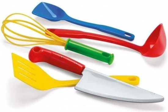 Maak je keukenset compleet met deze Dantoy bestekset. Met een soeplepel, broodmes, garder, spatel en opscheplepel maak je nu de heerlijkste soepen en sauzen in je eigen kinderkeuken. Lekker stevig dus heksensoep maken in de zandbak is ook een prima idee.