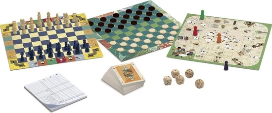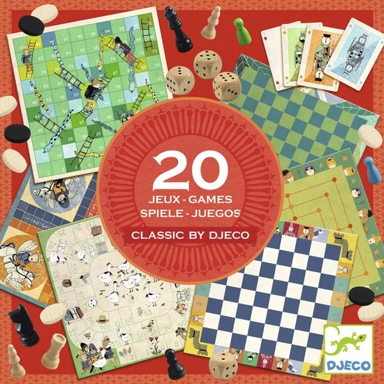 Met deze doos koop je 20 spellen in één! Het gaat om 20 klassieke gezelschaps-, denk- en kaartspellen, allemaal in een prachtige artistiek Djeco jasje gestoken.