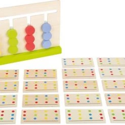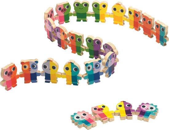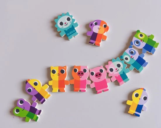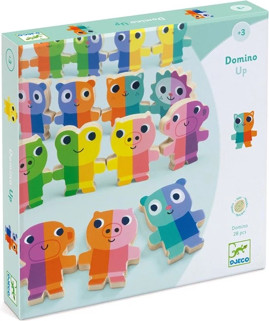 Een houten dominospel in een nieuw jasje van Djeco in vrolijke kleuren en grappige diervormen. In plaats van stippen hebben deze houten dominostukjes verschillende kleuren. Schik de diertjes met dezelfde kleur aan elkaar, of sorteer ze per diersoort. Voor een grotere uitdaging kunnen de donimostukjes overeind gezet worden.