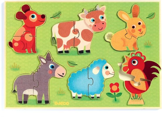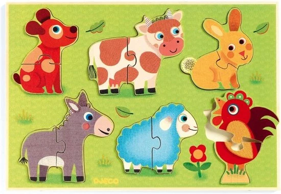 De puzzel Coucou Cow van het Franse merk Djeco is een inlegpuzzel voor de kleintjes. De grote puzzelstukken zijn gemakkelijk vast te nemen door kleine handjes. Elk dier bestaat uit 2 puzzelstukjes. De puzzel stelt 6 verschillende boerderijdiertjes voor, die telkens bestaan uit 2 puzzelstukken.