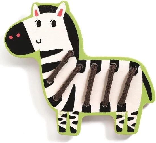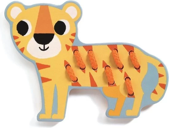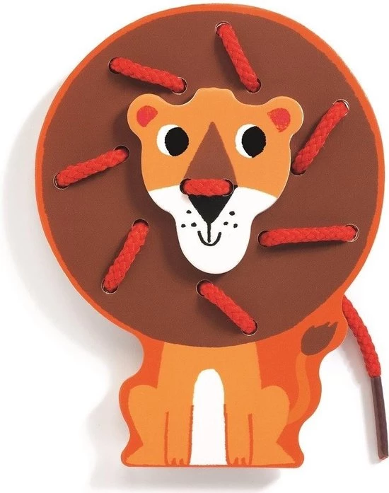 Leer rijgen met deze houten dieren van het Franse speelgoedmerk DJECO. Deze houten rijgkaarten hebben vrolijke afbeeldingen van een leeuw, een krokodil, een zebra en een tijger. Het grappige snoetje van de leeuw moet je er zelf op rijgen. Een creatief klusje dat goed is voor de ontwikkeling van de fijne motoriek. De set bestaat uit 4 dieren uit de jungle, een leeuwesnoet en een klein vogeltje en 4 rijgveters in verschillende kleuren.