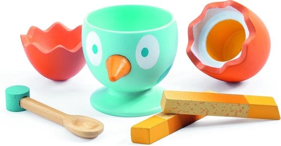 Een lekker ontbijtje maken, doe je met dit grappig houten speelsetje van Djeco. Het setje bestaat uit een eitje, eierhouder, lepeltje en broodstokjes. Een leuk ontbijtpakket voor in de kinderkeuken!