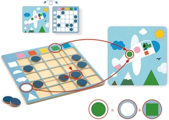 Hoe het kinderspel werkt: trek een kaart en geef op het antwoordbord aan hoeveel vormen er van elke kleur op het plaatje staan door de schijfjes op de juiste plek te leggen. Zodra alle kleuren en vormen zijn geteld, kan het kaartje omgedraaid worden om te controleren of de antwoorden juist zijn.