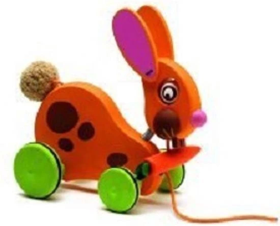 Leuk trekfiguur van Djeco. Dit haasje is vervaardigd van rubberwood. Heeft rubberloopvlak op de wielen. Afmeting 19,5 x 17 x 14 cm. CE Keurmerk. Vanaf 12 maanden.