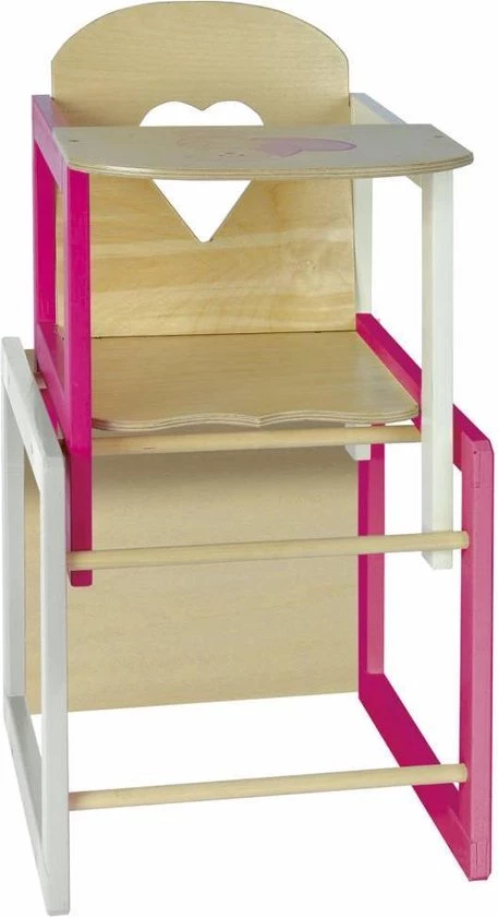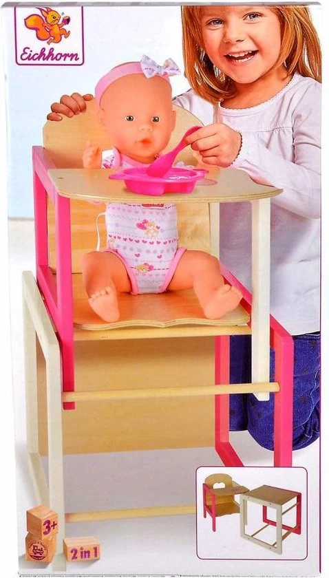 Met de hoogwaardige kinderstoel van Eichhorn kunnen moedertjes hun lieve babypoppen hun papje geven. Na het eten kan de hoge kinderstoel omgevormd worden naar een aparte stoel en tafel en kan je kleine babypop wat spelen. De hoge kinderstoel is 30x50x27cm groot en geschikt voor poppen van 35-49cm. Geschikt voor kinderen vanaf 3 jaar.