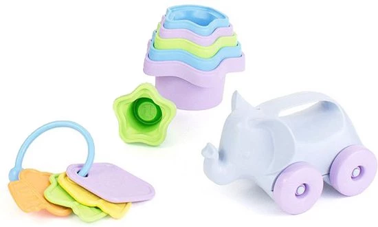 Het perfecte cadeau voor baby’s! Deze set bevat de Green Toys ? First Keys, Stacking Cups en Elephant-on-Wheels. De superveilige eerste toetsen zijn voorzien van 4 kleurrijke, uniek gevormde toetsen en bedels. Ze zijn lichtgewicht en gemakkelijk voor kleine handen te begrijpen. De stapelbekers bevatten 6 gegradueerde, genummerde cups voor speeltijd of badtijd. Ze kunnen in een toren worden gestapeld of worden genest voor eenvoudige opslag. De Elephant-on-Wheels is een perfect eerste duwspeeltje met een gemakkelijk te hanteren handvat.
