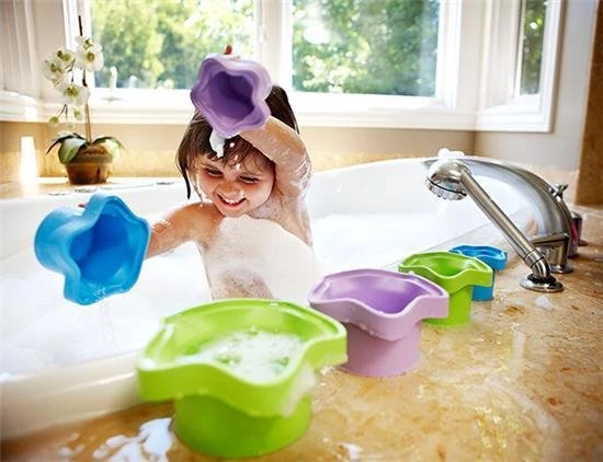 De stapelaar bestaat uit zes bekers die verschillen in grootte en kleur. Stapel ze op voor meer inzicht in grootte