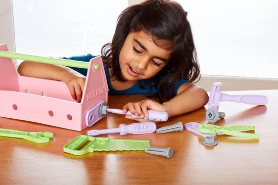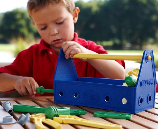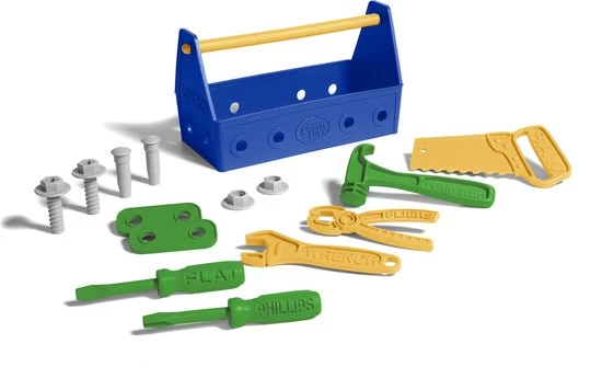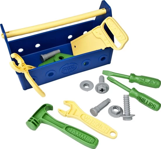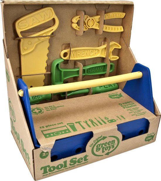 Deze Green Toys gereedschapskoffer ziet er bijzonder leuk uit en is ook zeer stevig en duurzaam. Hij bestaat uit: hamer, zaag, trektang, moersleutel, schroevendraaiers, bouten en moeren. Gemaakt uit 100% gerecycleerde plastic melkflessen. Green Toys doen aan ‘upcycling’. Bij recycling krijg je een product van dezelfde of mindere waarde. Upcyclen daarintegen maakt een product met een serieuze meerwaarde. Verpakt in 100% gerecycleerde verpakkingen. 100% recycleerbaar. 100 % BPA-, ftalaten- en PVC-vrij. Getest en goedgekeurd door de ‘Fairplace’-klussers: speelwaarde = 7/10, duurzaamheid = 8/10.
