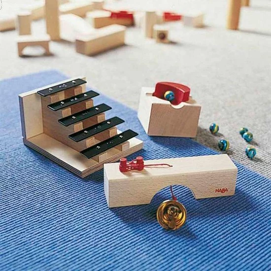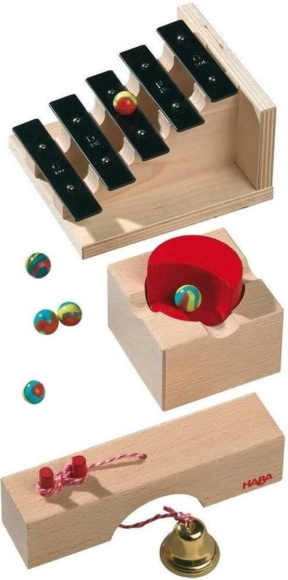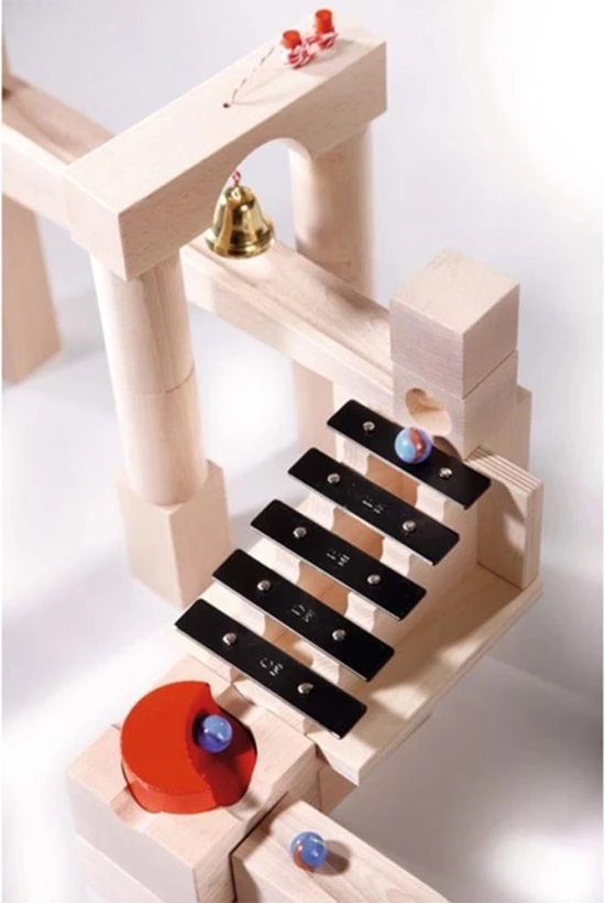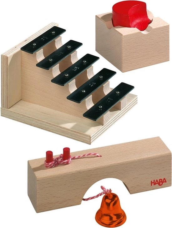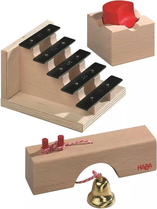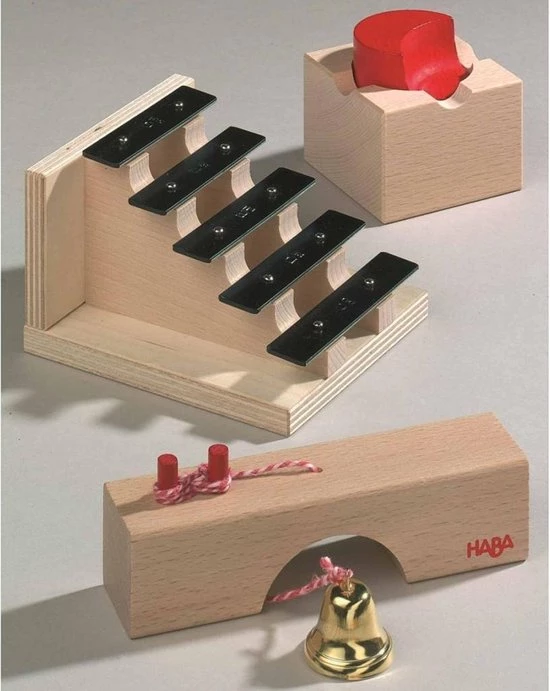 - 1 klanktrap, 1 brug met bel, 1 omkeerblok en 6 knikkers.