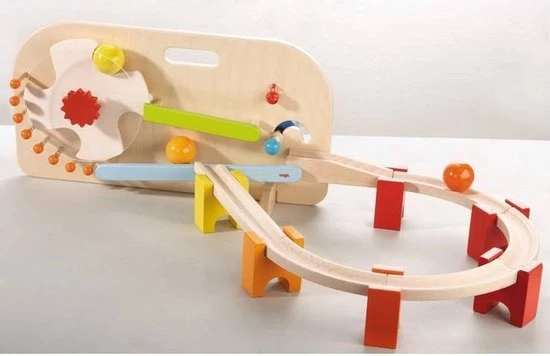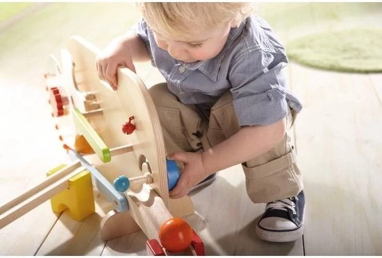 Dit is wel een zeer speciale extentie voor je Haba ‘mijn eerste knikkerbaan’. Al kan ook deze set probleemloos apart worden gebruikt. De knikker wordt aan het rollen gebracht door te draaien aan het rad. De sneller je draait, de sneller de knikker zal rollen.