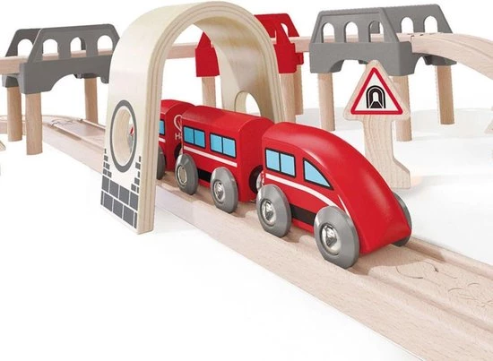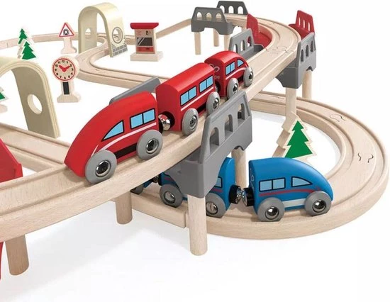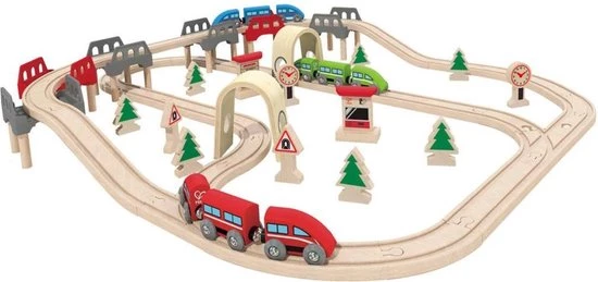 Afmetingen: 90 x 67 x 10 cm (L x B x H) Materiaal: hout, metaal, PE, PP en magneten Kindveilige materialen met niet giftige afwerking Bevat 85 onderdelen Met 3 treinen, bruggen, tunnels en meer Versierd met felle kleuren en een natuurlijke afwerking Speel op een nieuw niveau met deze ultieme set Helpt bij de ontwikkeling van hand-oog coördinatie, creativiteit en verbeelding Verken je creativiteit en boots echte situaties na Geschikt om steeds andere treinbanen te maken Aanbevolen leeftijd: 3+ jaar