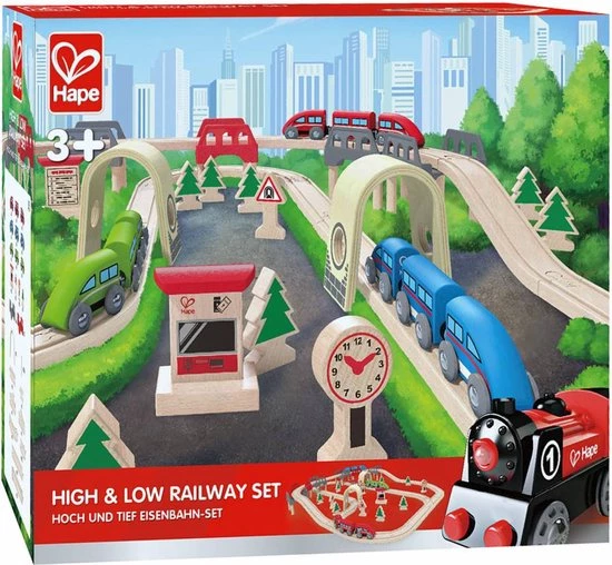 Speel op een nieuw niveau met de ultieme Hoog & Laag treinset van Hape! De set bevat 3 sneltreinen, bruggen, tunnels, bomen, borden en meer. De trein helpt bij het ontwikkelen van hand-oog coördinatie, creativiteit en verbeelding. Deze hoog & laag treinset, gemaakt van stevig hout met felle kleuren en een natuurlijke afwerking, gaat lang mee. Hij is geschikt voor kinderen van 3 jaar en ouder. Levering bevat 85 onderdelen.