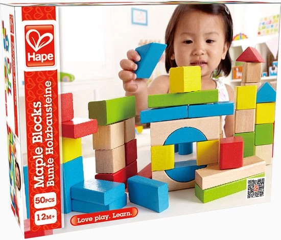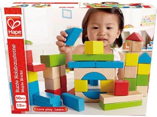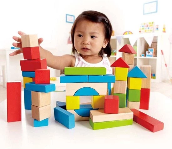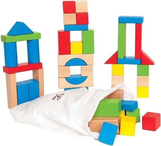 Met deze robuuste blokken zullen vele generaties de mooiste bouwwerken maken. Maak met de verschillende vormen hoge of brede torens. Bouw zo hoog je maar wilt, tot de boel omvalt. Je kunt ook een leuk huisje bouwen met de blokken.