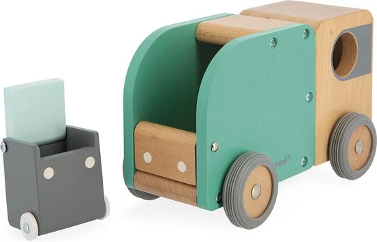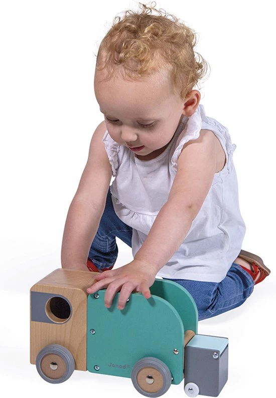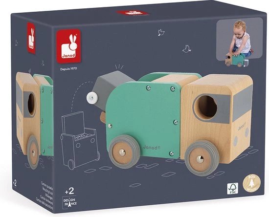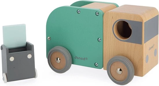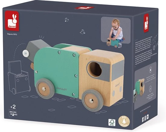Een leuke houten vuilniswagen om uw kind van kleins af aan bewust te maken van ecologie en recycling. Deze vrachtwagen is voorzien van een vuilnisbak met magneten aan de achterkant. Deze kantelt en opent om de inhoud te legen, net zoals in het echt! De vrachtwagen beschikt over perfect stille, rubberen wielen. Perfect om de fijne motoriek en verbeelding te ontwikkelen. Speelgoed van massief FSC TM hout en waterverf. Ontwikkelingsspeelgoed voor kinderen vanaf 2 jaar.