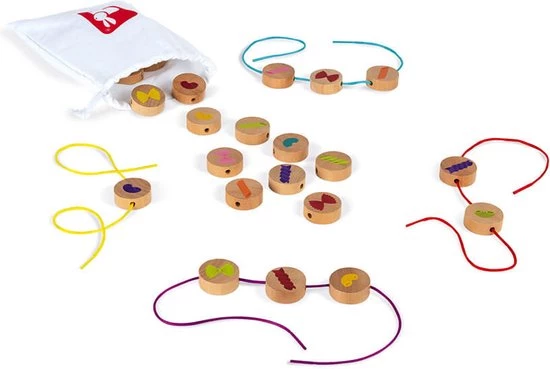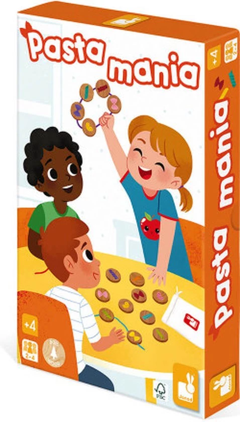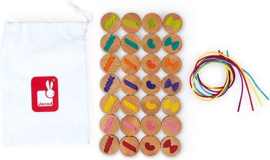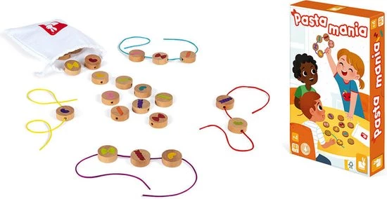 Wie maakt het snelst een mooie noedelketting? Het favoriete cadeau van de ouders was de inspiratie voor dit matchspel voor kinderen vanaf 4 jaar. Het principe ? Iedereen pakt blindelings een van de houten kralen op waarop pasta’s van verschillende vormen en kleuren zijn afgebeeld. Zodra er 3 noedels van dezelfde vorm of kleur tegelijkertijd op het bord worden gevonden, moeten spelers zich haasten om ze zo snel mogelijk te vangen! De snelsten kunnen er dan een houden om hun halsband compleet te maken. De eerste speler die een halssnoer met 5 parels heeft gemaakt, wint! Bij dit spel gebruiken we onze logica, ons observatievermogen en onze snelheid! Deze set bevat 28 houten kralen, 4 touwtjes en 1 stoffen zakje. De kralen zijn van massief hout, de tas en de touwtjes van stof. Dit spel is FSC-gecertificeerd (hout uit duurzaam beheerde bossen).