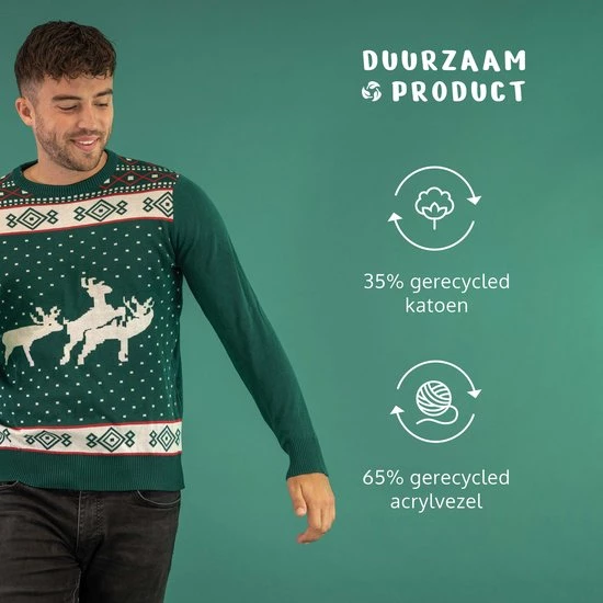 De kersttruien zijn 100% recyclebaar. Onze kersttruien worden gemaakt van 65% gerecycled acrylvezel en 35% gerecycled katoen. Bij aankoop van deze leuke kersttrui ben je dus ook nog eens duurzaam bezig.
