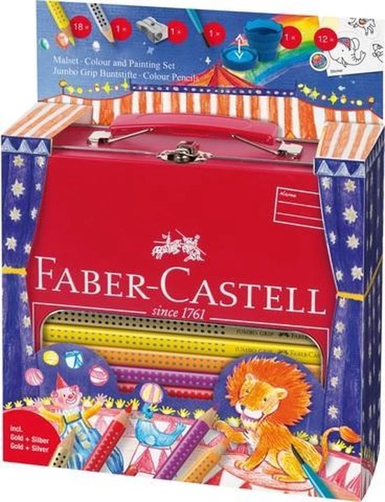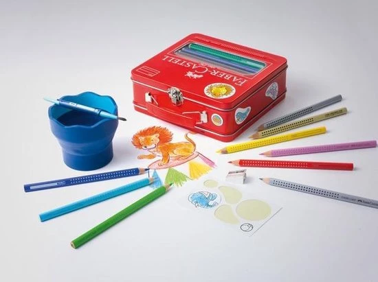 Leuke schoolset voor kinderen, metalen blik met handvat om makkelijk mee te nemen. Inhoud: 18 jumbo kleurpotloden, 1 Jumbo Grip grafietpotlood, 1 watercup, 1 Clic&Go penseel, 1 potloodslijper en 2 stickervellen.