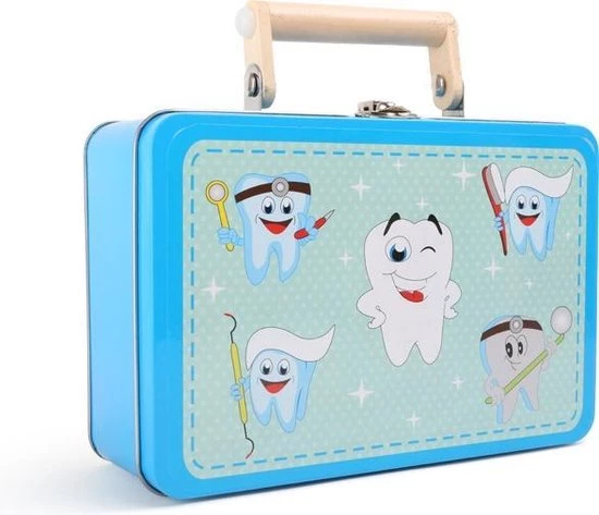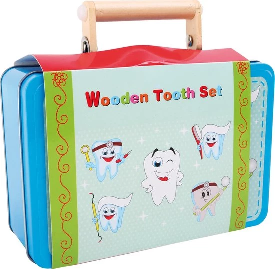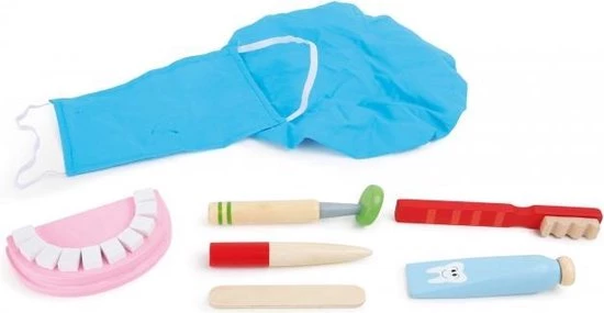 Wie zijn kinderen wil voorbereiden op de tandarts, kan dat met deze spelset doen. Hier wordt precies uitgelegd, wat in de tandartspraktijk gebeurt. De kinderen kunnen zich met het mondkapje van stof en kapje een echte tandarts voelen en leren met het gebit, tandenborstel en tandpasta goed tandenpoetsen. Het tandartsgereedschap is van robuust hout gemaakt en kan in de mooie metalen koffer worden opgeborgen. Zo kan het altijd makkelijk worden meegenomen.