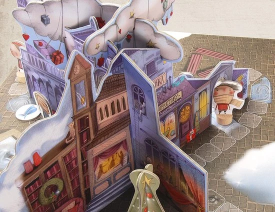 doos 16 x 32 cm, spelbord 45 x 30 cm, 1 huis met 2 wolken (3D), 7 spelfiguren, 26 cadeautjes en een kerstboom. Eco uitgave