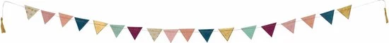 Vlaggetjes slinger van lokta papier. Elke slinger is anders, door het gebruik van varierend lokta-papier. De slinger is 1 meter lang, en de vlaggetjes zijn 3 cm hoog. Leuk als versiering voor verjaardagen, partijtjes of gewoon ter decoratie in je huis.