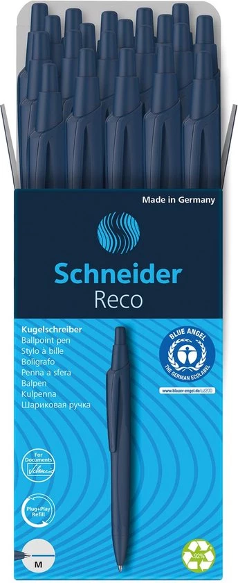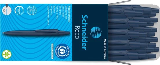 De eerste balpen in de wereld die bekroond is met het meest bekende Eco-label Blauer Engel. Voor een balpen is dit uniek omdat het lastig is voor balpennen om aan de Blauer Engel voorwaarden te kunnen voldoen, echter deze kan dat! Deze hervulbare balpen heeft een behuizing die voor 92% gemaakt is van gerecycled plastic. De pen ziet er mooi uit met zijn moderne en dynamische ontwerp, en door de matte glanzende kleuren wordt dit nog spectaculairder. De Reco pen is verkijgbaar in 3 verschillende kleuren: zwart, donkerblauw en wit. Deze pen is voorzien van een stabiele, versterkte en onbreekbare clip en grote navulling (Eco 725), ook gemaakt van 95% gerecycled plastic in lijndikte M. De pen kan zo vaak als nodig worden bijgevuld door de los verkrijgbare vullingen. (Deze navullingen zijn verkrijgbaar in schrijfbreedte M en F en in de inktkleuren blauw en zwart.) De schrijfkleur van de pen wordt aangeduid door een kleurstip op de drukknop van de pen. De inkt is documentecht volgens ISO 12757-2. Dit betreft de donkerblauwe versie met schrijfkleur blauw (M).