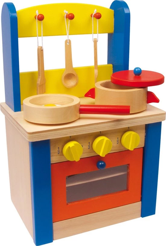 Een mooi kleurrijk gelakt houten keukentje met 7 accessoires. Vanwege het formaat kan het makkelijk worden meegenomen op reis.