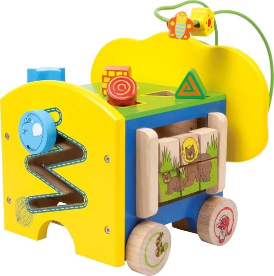 Houten activiteiten kubus in de vorm van een olifant. Voorzien van 4 Houten wielen.