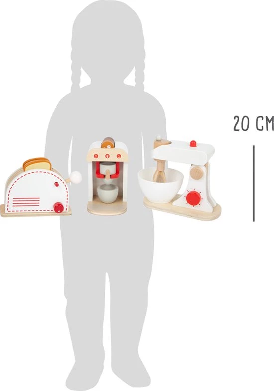 Populaire keukenhulpjes in een complete set! Deze set keukenhulp biedt een broodrooster, koffiezetapparaat en mixer, wat betekent dat het alles heeft wat een goed geoutilleerde speelkeuken nodig heeft. De houten speelgoedapparaten bevorderen het actieve rollenspel en hebben speciale functies voor bijzonder realistisch spel. Naast de klikgeluiden voor de knoppen heeft de toaster ook een pop-up functie om de afgewerkte toast uit de toaster te lanceren. De garde is draaibaar en opvouwbaar. Deze praktische apparaten zijn de nieuwe favorieten van jonge chef-koks! De draaiknoppen op het broodrooster en de mixer maken klikgeluiden en de koffiepercolator heeft koffiebonen in verschillende sterktes zodat u espresso, cappuccino, koffie of latte macchiato kunt maken zoals u dat wilt.