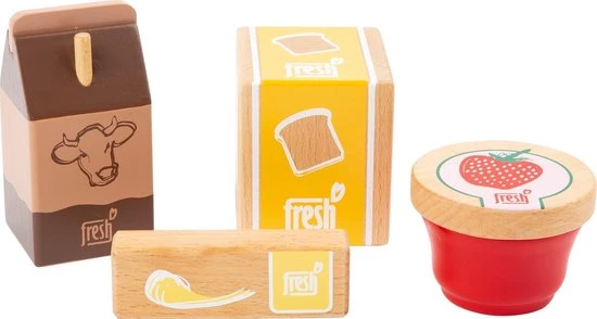 De tafel is gedekt! Deze vierdelige ontbijtset van hout biedt alles voor een smakelijk begin van de dag. Naast toast, marmelade en boter is er ook cacao! Alle producten zijn vervaardigd van robuust hout en bedrukt met aantrekkelijke en gemakkelijk te begrijpen motieven.