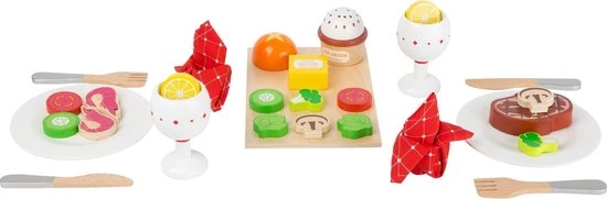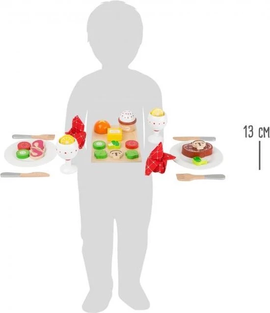 Hier wordt dineren een echte ervaring. Alles wat nodig is voor een stijlvol diner kan op de placemat worden geplaatst. Alle benodigde keukengerei is gemaakt van robuust hout. De biefstuk kan worden gescheiden via de stukken klittenband en de slagroom voor het ijs is bevestigd met een magneet. Een prachtige mogelijkheid om sociale competenties en creativiteit te ontwikkelen met rollenspellen. Wie wil hier geen lekkere maaltijd eten? De set bestaat uit 30 stuks.
