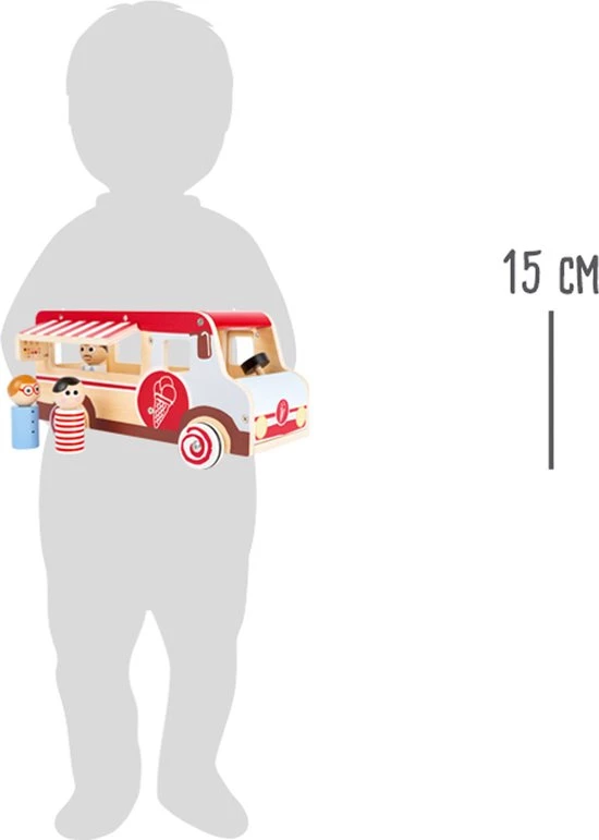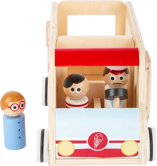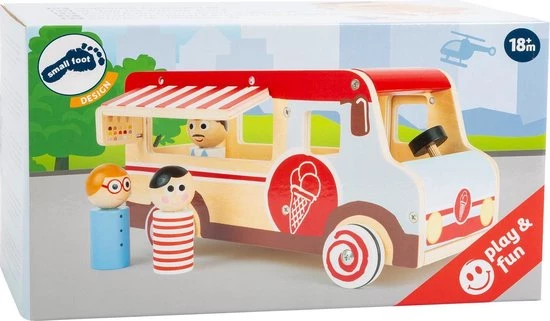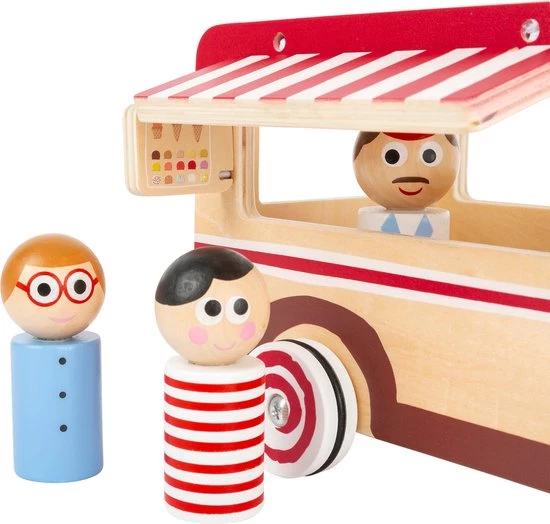 Ring-a-ling, het is tijd voor een ijsje! Deze extra grote ijscowagen van robuust hout met rubberen wielen ligt bijzonder goed in de handen van jonge kinderen. Van bovenaf bespeelbaar en uitgerust met een scharnierend verkoopraam en te openen bestuurdersdeur, vervult het al hun ijswensen. Een scharnierend ijsbord met gedetailleerde prints van ijssoorten en drie houten figuurtjes maken de pret compleet. Met dit speelgoedvoertuig kunnen kleine rollenspellen in het thema ijs naar hartenlust worden gerepeteerd – het is leuk en bevordert de communicatie bij zowel jonge verkopers en -vrouwen als jonge ijsliefhebbers. Welke ijssmaak wil je?