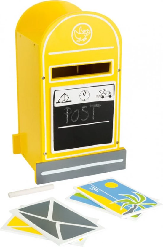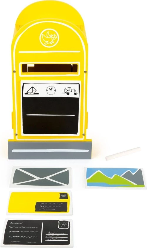 De post is aangekomen! Deze gele brievenbus is een echte blikvanger in de speelkamer. Op het krijtbord aan de voorkant van de brievenbus kan worden geschreven of getekend met het meegeleverde krijt. Vier houten beschrijfbare ansichtkaarten en brieven maken deze set helemaal compleet! De brieven kunnen door de sleuf in de brievenbus worden gegooid. De brievenbus kan heel makkelijk worden geleegd via de deur aan de achterkant.
