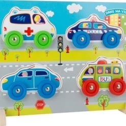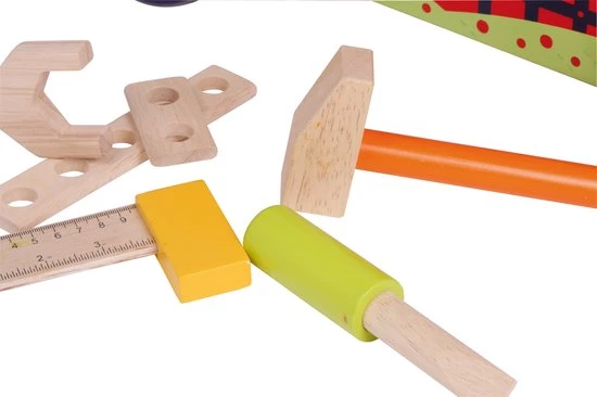 Een mooie motoriekwagen van gelakt hout, degelijke MDF-platen, massief hout en onbehandeld beukenhout. Je kunt verschillende spellen spelen op deze wagen. Er zit bijvoorbeeld een vormenstoof op en een werkbank met gereedschap(hamer, zaag en schroevendraaier), materiaal (schroeven, moeren en verbindingsstukken) en een bankschroef. De gemakkelijk lopende wielen aan metalen assen hebben rubberringen voor zachte loopgeluiden. Onder de zitting met gaten zit een opbergruimte. Speelplezier gegarandeerd!