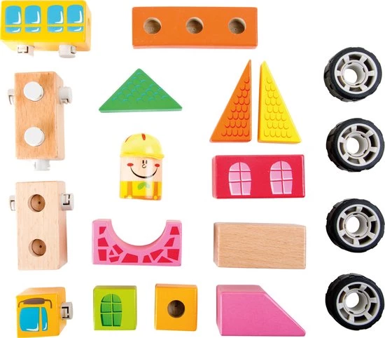 Deze stijlvolle schoolbus is onderweg naar school. De robuuste houten stenen kunnen worden opgestapeld om een schoolgebouw te maken. De schoolbus is niet niet zo snel opgebouwd, hier zijn vaardigheden voor nodig. Het plug-in-systeem kan heel eenvoudig worden gemonteerd en de buschauffeur kan op weg naar zijn volgende reis.