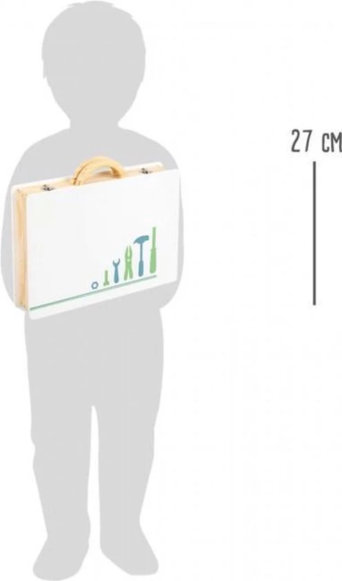 Nu kunnen de doe-het-zelf projecten echt van start gaan! Met deze houten gereedschapskist in Scandinavisch design worden jonge ambachtslieden echt professionals. De rijk gedetailleerde accessoires zoals een liniaal met geïntegreerde waterpas en een handige accuschroevendraaier met bits die met behulp van magneten kunnen worden verwisseld, voldoen aan al hun wensen! Inclusief 43-delig toebehoren bestaande uit 5 gereedschappen, 1 boor, 3 bits, 11 schroeven, 11 moeren, 11 moeren en 12 geperforeerde strips. Met de vergrendelingsclips kan alles veilig worden opgeborgen en met de houten draaggreep is deze gereedschapskist klaar voor jonge jongens en meisjes op het volgende thuisprojectstation.