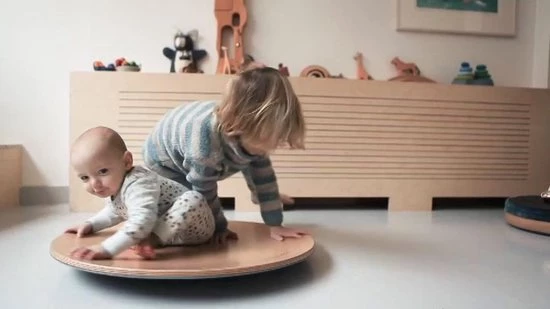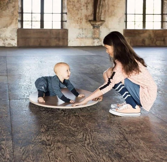 Op de Wobbel360 balanceren kinderen graag staand. Dat gaat heel lekker en via een zachtere curve dan op de Wobbel Original. Ze zitten erin om bootje te varen en zittend te schommelen. Zittend draai je jezelf of een ander heerlijk rond. Je kan ook net als met een skateboard jezelf staand ronddraaien met een flinke zwaai. Verder nodigt hij uit om lekker balans op te oefenen. Via de rand een rondje te lopen of elkaar op te wiebelen. Met een beetje kracht loopt de Wobbel360 met je mee: de Wobbelloop. Maar er is ook spel mogelijk waarin de natuurkundige wetten ervaren worden. Met autootjes/balletjes. Draaien, schommelen, bewegen. En omgedraaid is het een schans, een podium, een zitplek. Ook bij deze Wobbel360 is het wat jouw kind wilt dat het is! Voor de papa’s en mama’s: je draait heerlijk de onderrug erop los en er is al veel interesse vanuit staand werken gekomen. Hierop sta je nooit helemaal stil en kan je bewegend werken en leren. Aan de onderkant zit persvilt, gerecycled materiaal (per 360 wel zo’n 20 petflessen) en immens sterk en goed schoon te houden.